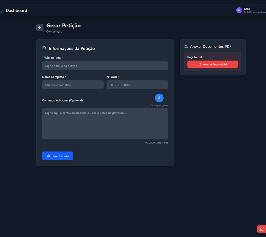 Você informa os dados do caso, e o sistema gera peças completas, coerentes e bem estruturadas — prontas para revisão e protocolo.