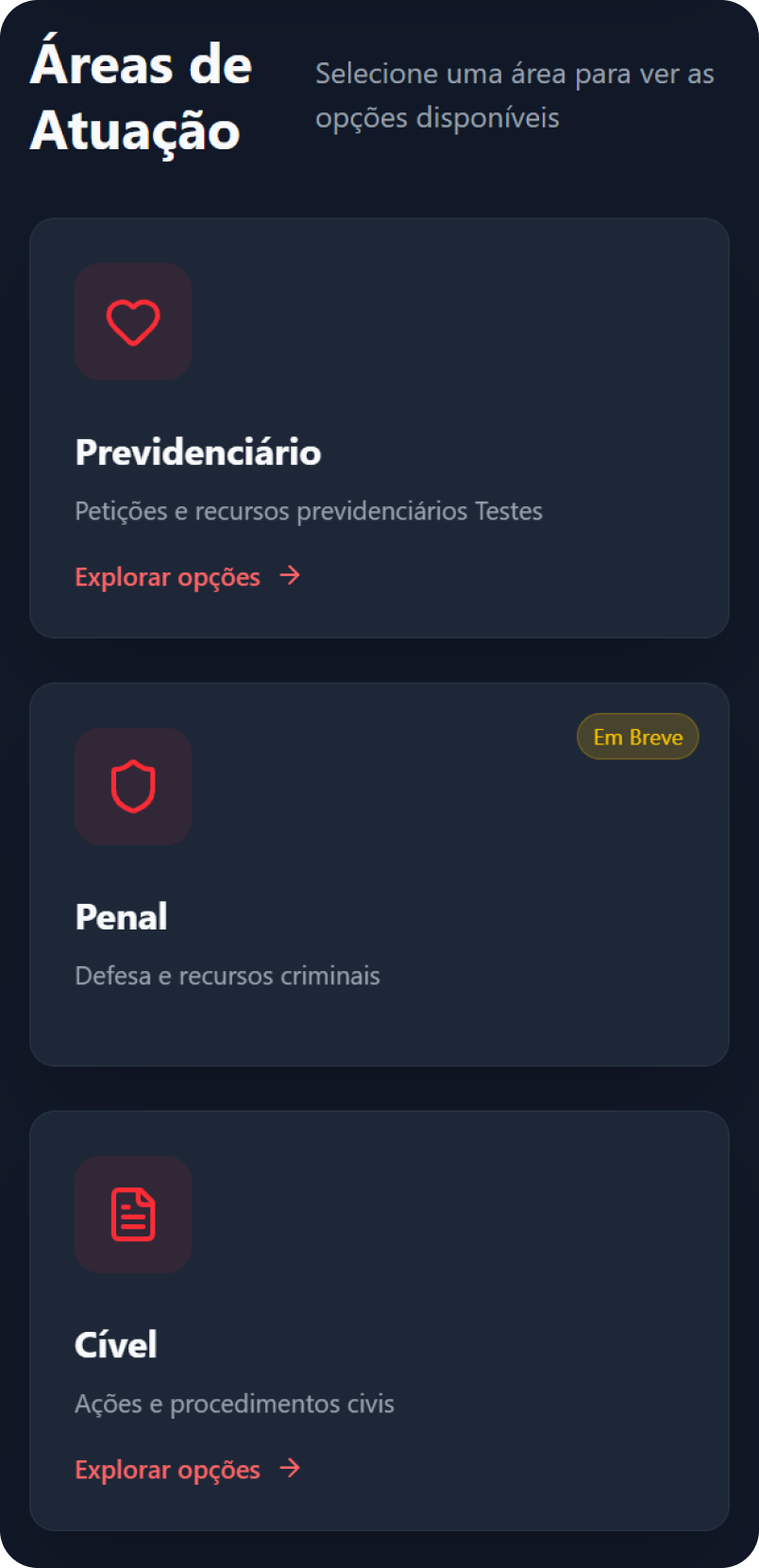 Você pode criar petições iniciais, contestações, recursos, contratos e outros documentos jurídicos em diversas áreas do Direito, como cível, trabalhista, empresarial e mais.